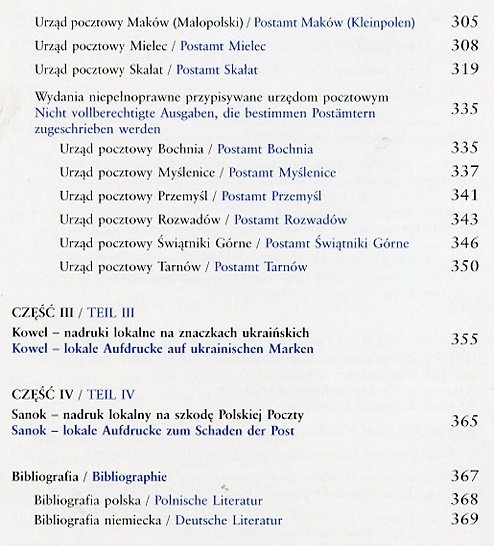 Den historischen Hintergrund der Lokalausgaben und den derzeitigen Forschungsstand umreißt die informative Einleitung. In alphabetischer Reihenfolge schließen sich Abschnitte zu den einzelnen Postämtern an, eingeteilt nach Besatzungsgebieten. Das bei Weitem umfangreichste Kapitel ist dem Gen.-Gouv. Warschau gewidmet, gefolgt von dem vordem österreichischen Teschen Schlesien und Galizien und schließlich Kowel (Ex-Ukraine). Jeder „Steckbrief“ enthält neben relevanten Fakten und Daten eine klare Aussage zum amtlichen bzw. spekulativen Charakter der Ausgabe und wo nötig eine ausführliche kontroverse Diskussion wie etwa bei den Marken des Postamts Skierniewice oder Bielsko. Erstmals aufgenommen sind auch einige bisher unbekannte Ausgaben.
